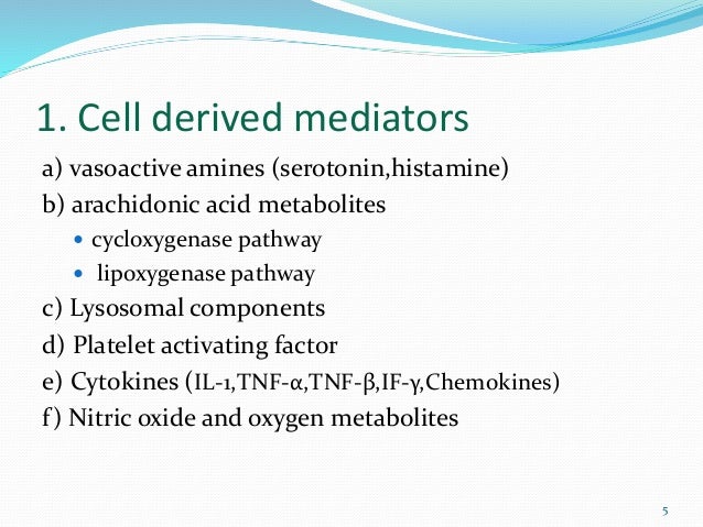 Chemical Mediators Substances that initiate or regulate inflammation Regulate. Cell derived or plasma protein derived vasoactive amines lipid products cytokines products of complement activation. Platelets neutrophils monocytesmacrophages vascular endothelial cells and tissue cells like mast cells fibroblasts and smooth muscle cells Where in the body are endogenous chemical mediators usually produced in general.
