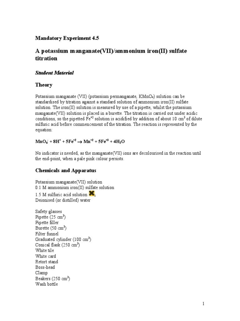 A Potassium Manganate Vii Ammonium Iron Ii Sulfate Titration Titration Chemistry